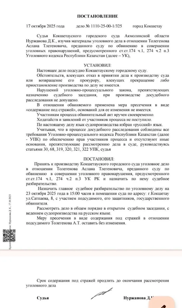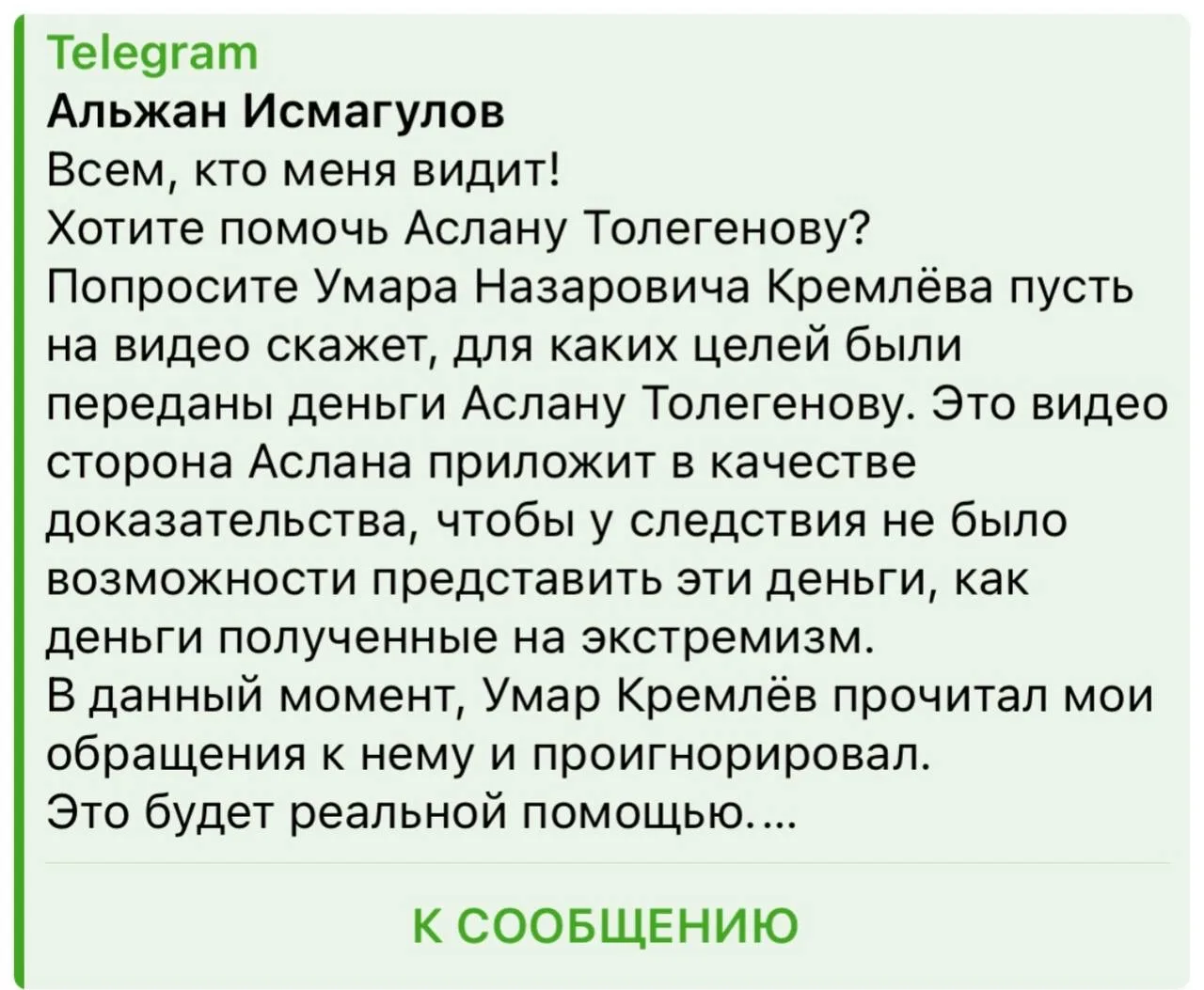 ▪️Факт изъятия денег при обыске в доме Тулегенова был известен узкому кругу лиц — среди них адвокат, родственники и сотрудники КНБ. Однако по странному стечению обстоятельств данный факт 4 октября был обнародован другим блогером — Альжаном Исмагуловым, который призвал российского мецената и спортивного функционера Умара Кремлёва записать видео с подтверждением передачи средств Тулегенову «на лечение». Сейчас данная публикация Исмагулова уже недоступна.