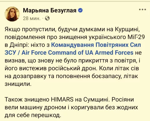 Безуглая также прокомментировала уничтожение украинского МиГ-29 в Днепропетровске. По её словам, командование Воздушных Сил ВСУ не признало, что не обеспечило воздушное прикрытие, что позволило российскому дрону выследить самолет. При дозаправке и пополнении боезапаса МиГ-29 был уничтожен.