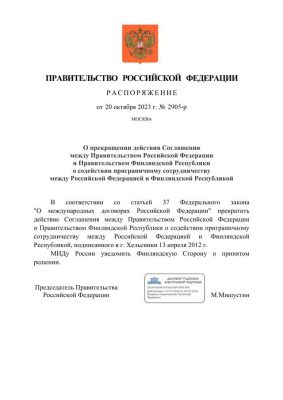 Соответствующий приказ подписал премьер-министр Михаил Мишустин. Вероятней всего, разрыв отношений с финскими властями является ответом на ряд ограничений в адрес россиян на территории Финляндии.