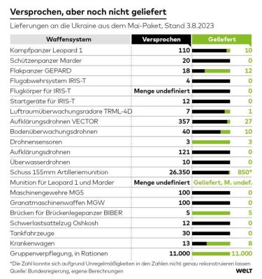 В список планируемых поставок входили 110 танков «Leopard-1», 20 боевых машин пехоты «Marder», 18 танков «Gepard», 4 зенитные установки «Iris-T» и 26 350 артиллерийских боеприпасов.