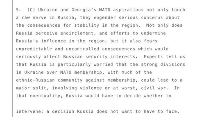 В посольском анализе Бёрнс написал, что вступление Украины в НАТО — красная линия, воспринимаемая как экзистенциальная угроза, которая потребует от Москвы «решения, стоит ли вмешиваться; решение, с которым Россия не хочет сталкиваться».
