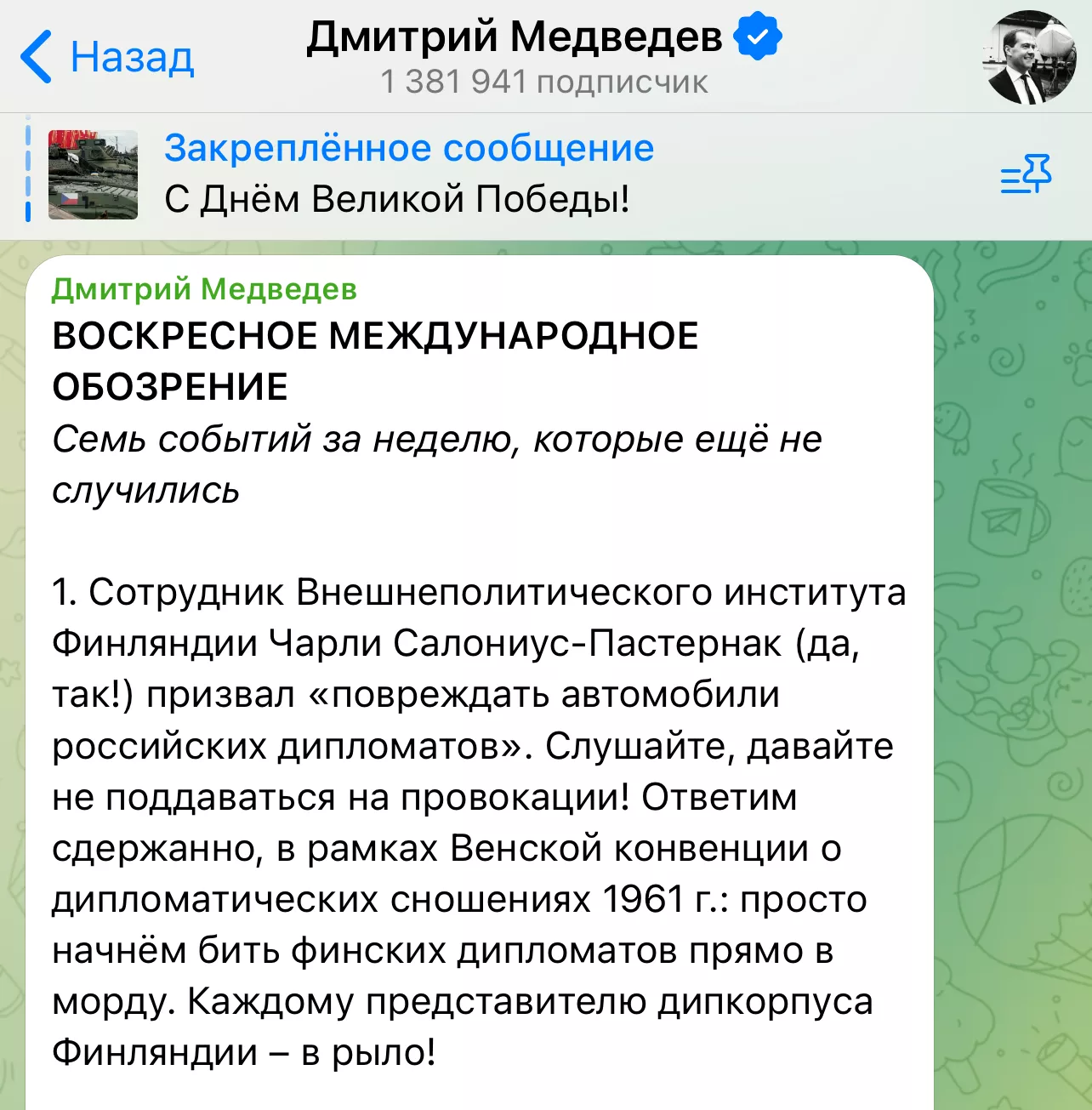 1. Сотрудник Внешнеполитического института Финляндии Чарли Салониус-Пастернак (да, так!) призвал «повреждать автомобили российских дипломатов». Слушайте, давайте не поддаваться на провокации! Ответим сдержанно, в рамках Венской конвенции о дипломатических сношениях 1961 г.: просто начнём бить финских дипломатов прямо в морду. Каждому представителю дипкорпуса Финляндии – в рыло!