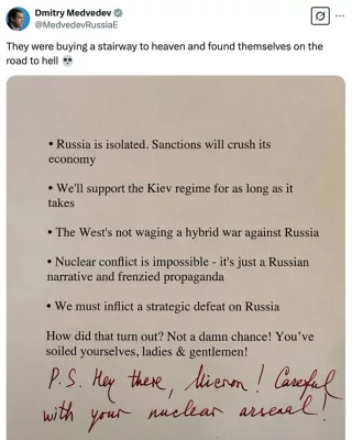 «P. S. Привет, Микрон! Осторожнее со своим ядерным арсеналом!» — добавил зампред Совбеза РФ.