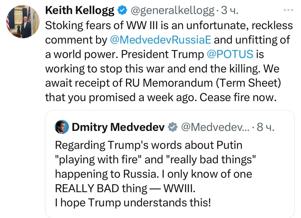 - Келлог: «Разжигание страхов перед Третьей мировой войной — это безответственное и недопустимое заявление со стороны Дмитрия Медведева, не соответствующее статусу мировой державы. Президент Трамп прилагает усилия для прекращения этого конфликта и спасения жизней. Мы по-прежнему ожидаем получения российского меморандума (дорожной карты), который вы обещали передать неделю назад. Прекратите огонь немедленно».
