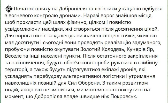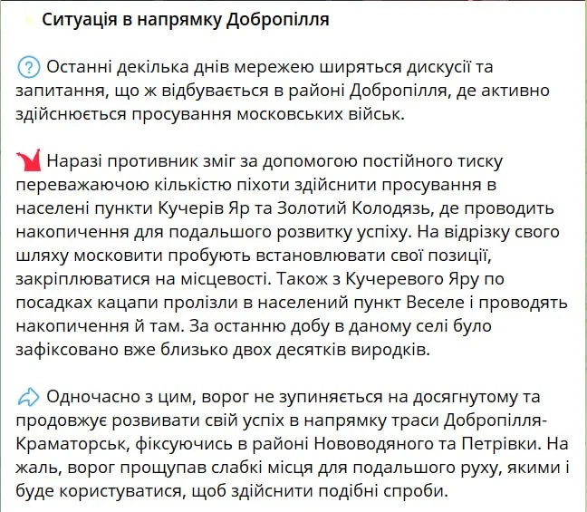 Одновременно ВС России продвигаются к трассе Доброполье – Краматорск, закрепляясь в районах Нововодяного и Петровки. Некоторые украинские военные паблики пишут, что «трасса уже перерезана».