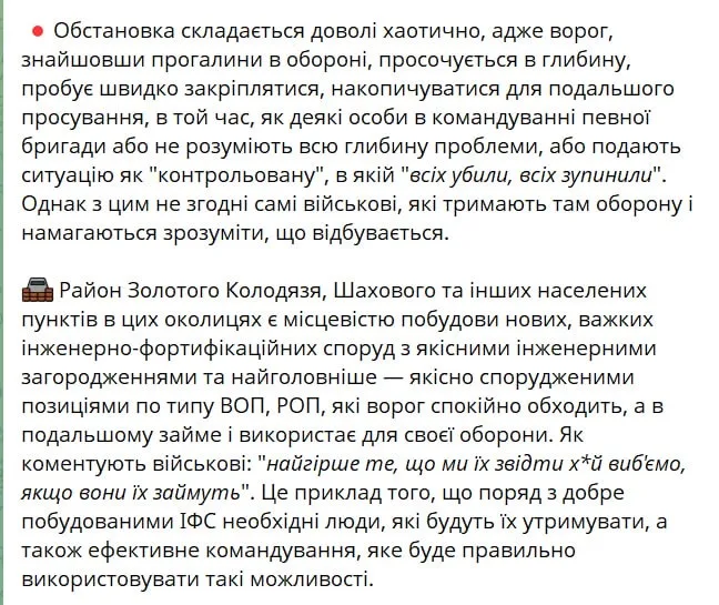 Ситуация осложняется тем, что ряд новых инженерно-фортификационных сооружений в районе Золотого Колодязя и Шахового, построенных с качественными позициями и заграждениями, остаются без достаточного личного состава и могут быть заняты российскими силами. По словам военных, в таком случае выбить их оттуда будет крайне сложно.