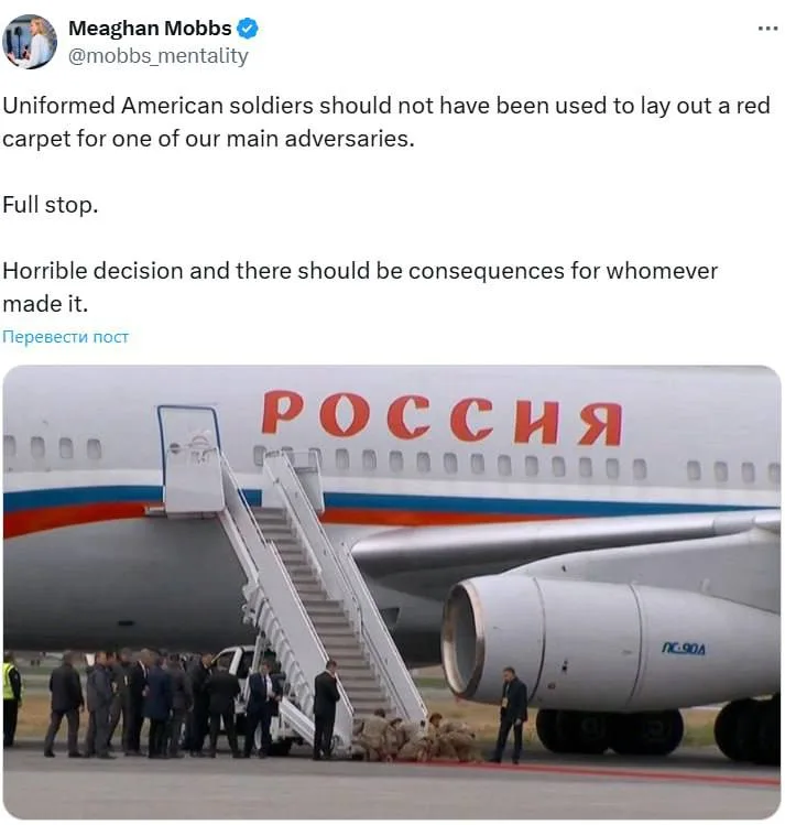 «Американских солдат в форме не следовало использовать для расстилания красной дорожки перед одним из наших главных противников. Точка. Ужасное решение, и тот, кто его принял, должен понести последствия», – написала Меган Моббс в Х.