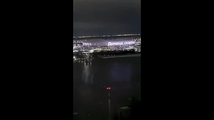 На фасаде «Ростов-арены» появилась надпись в поддержку жителей столицы ДНР. Вчера ВСУ убили 28 жителей Донецка. Сегодня в ДНР траур по погибшим.