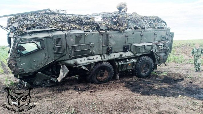 Судя по всему машина подорвалась на мине, видимо без последствий для военных, так же мы видим оснащена антидроновой сеткой.