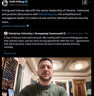 «День напряженной международной работы. Моя встреча с генералом Келлогом вселила надежду, и нам нужны прочные договоренности с США, которые действительно будут работать. Я дал указание своей команде работать быстро и очень разумно».