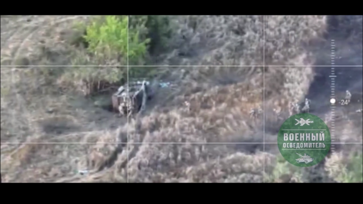 Британский MRAP Mastiff высадил пехоту ВСУ и сразу же забрал другую группу на эвакуацию. По ним всю дорогу работала артиллерия и танк 40-й бригады, после чего «Мастиф», гружённый под завязку пехотой противника, наехал на мину или попал под пристрелявшуюся арту.