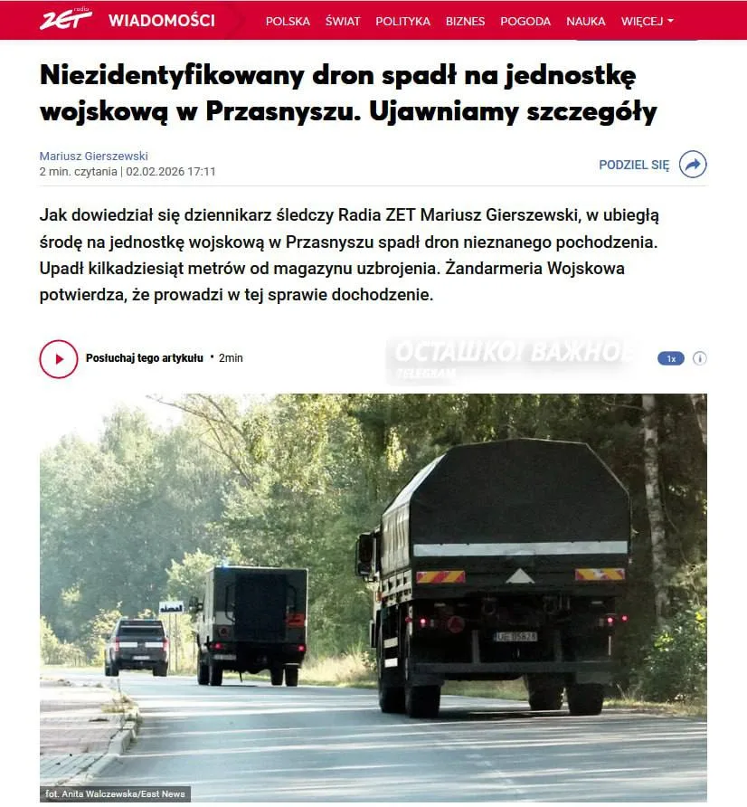 По данным Radio ZET, дрон некоторое время кружил над объектом и упал примерно в 70 метрах от склада вооружений. Военнослужащие наблюдали его полёт, но не смогли вмешаться.