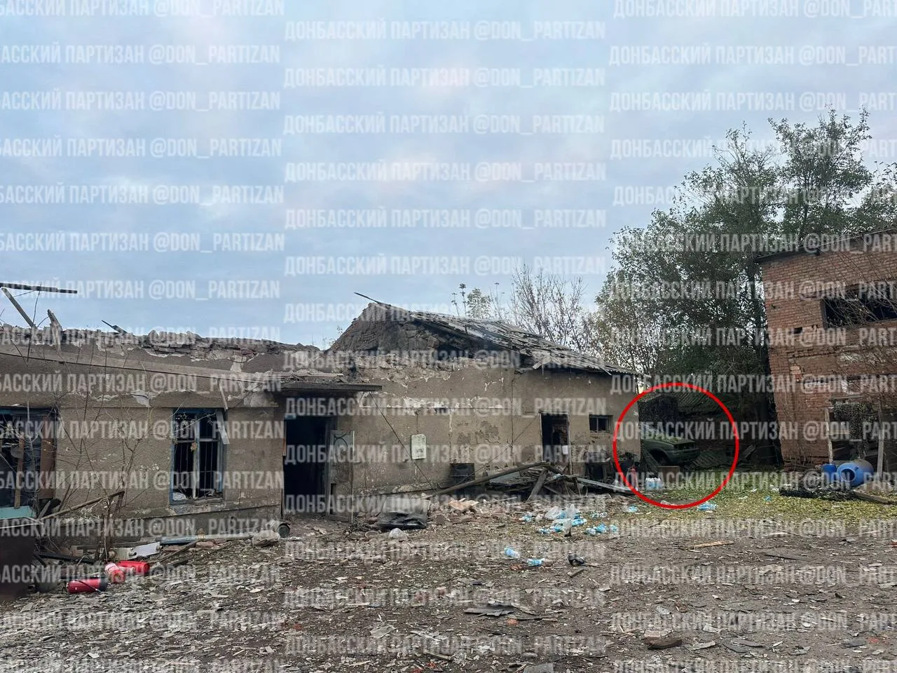 На месте удара фиксируются осколки бронепластин, обрывки тактических разгрузок, частично сохранившиеся элементы боеприпасов 5,45×39 и РПГ-7, что подтверждает использование объекта в качестве действующего штаба и вооружённого поста.