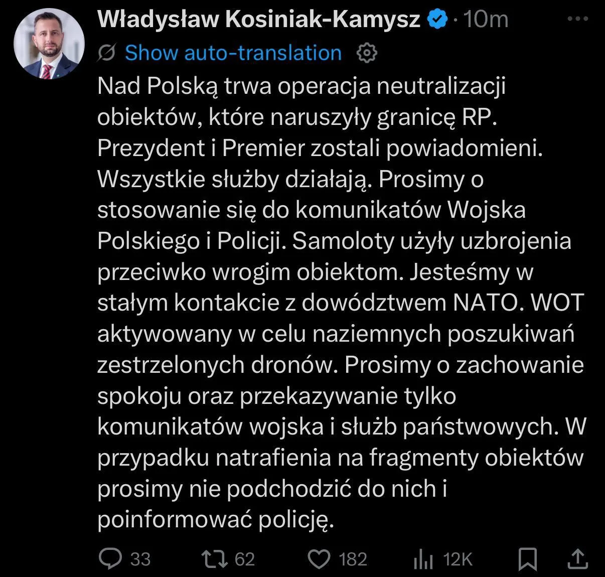 ▪️ Главным событием суток становится реакция Польши на якобы заход «Гераней» в свое воздушное пространство на 50 км. Польское Минобороны и президент сообщили о контрдействиях против воздушных целей, также писали о взлете истребителей F-16 ВВС Польши для перехвата беспилотников и работы средств ПВО у Жешува. Обломков или кадров именно с российскими дронами пока опубликовано не было, хотя министр обороны Польши утверждает, что «все сбито»