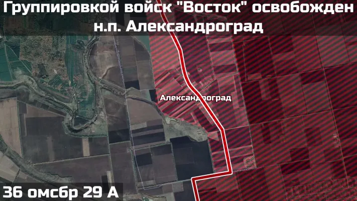- На Южно-Донецком направлении ГрВ «Восток» освободила н.п. Александроград ДНР Бойцы 36 гвардейской бригады взяли очередной узел обороны противника, уничтожив до роты живой силы ВСУ в боях за населённый пункт и прилегающие лесополосы.
