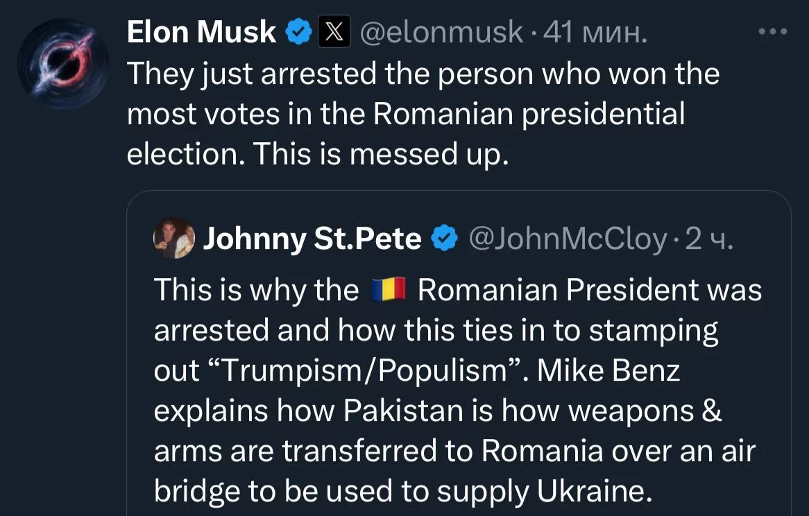 Илон Маск назвал арест «полным бардаком». Джорджеску грозит до 20 лет тюрьмы по обвинениям в создании «фашистской организации» и подрыве конституционного строя. Он победил в первом туре выборов, но позже Конституционный суд аннулировал результаты.