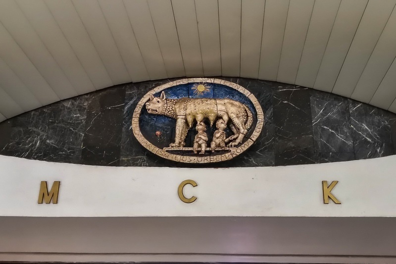 Сразу после спуска по эскалатору, над головой расположена майоликовая скульптура «Капитолийская волчица», которая кормит двух младенцев — близнецов из легенды о братьях Реме и Ромуле, основавших Рим.
