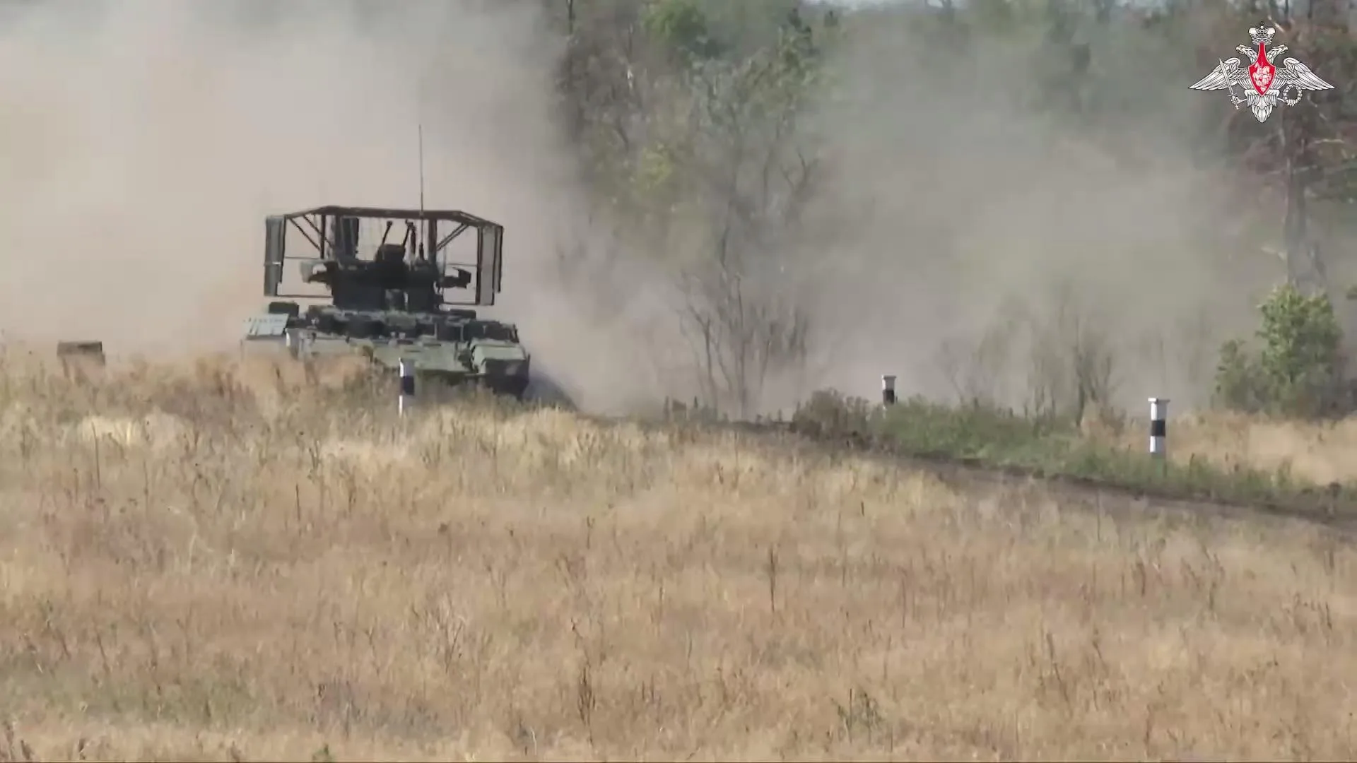 - Экипажи отрабатывают скоростной выход из района базирования на огневой рубеж и ведение огня с ходу по статичным целям на удалении до 1500 метров из спаренной 30-мм пушки и автоматических гранатометов.