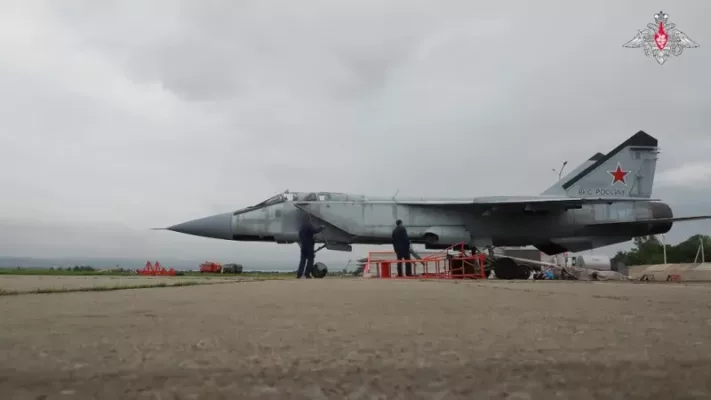 Пара высотных истребителей-перехватчиков МиГ-31БМ в ходе выполнения полетного задания по истребительно-авиационному прикрытию корабельной ударной группы Тихоокеанского флота над нейтральными водами Японского моря перехватила условного противника в рамках СКШУ «Океан-2024».