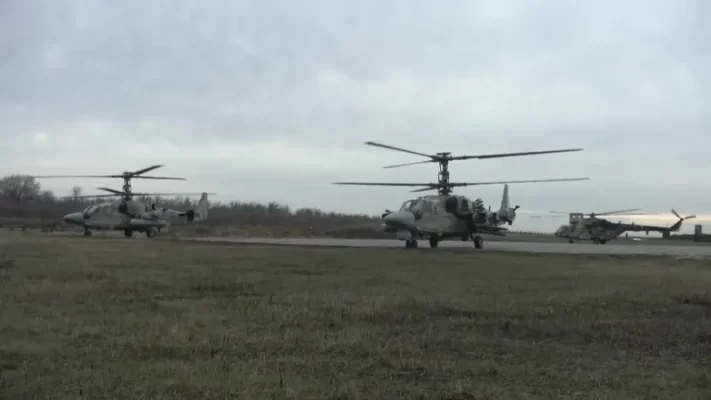 Экипажи ударных вертолетов Ка-52 при помощи неуправляемых авиационных ракет поразили опорные пункты и живую сила противника на краснолиманском направлении с максимально близкого расстояния.
