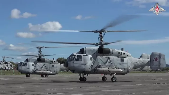 Пара транспортно-боевых вертолётов Ка-29 морской авиации Тихоокеанского флота в ходе СКШУ «Океан-2024» отработала задачи по огневому поражению десанта и кораблей условного противника.
