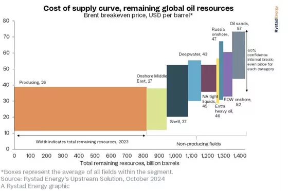 Согласно последнему исследованию Rystad Energy, наземный Ближний Восток является самым дешевым источником новой добычи со средней ценой безубыточности всего в $27 за баррель. Этот сегмент также может похвастаться одним из самых значительных ресурсных потенциалов.