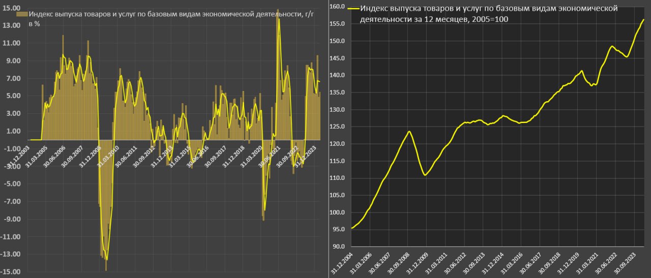Индекс выпуска товаров по базовым видам экономической деятельности (основной и наиболее репрезентативный прокси на ВВП) вырос на 5.5% г/г, за первые 4 месяца 2024 рост на 6.3% г/г. По сумме за 12 месяцев прирост на 7% г/г.