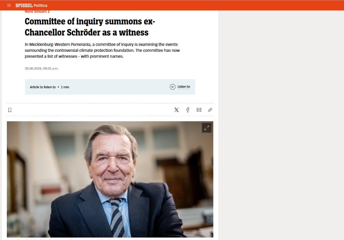 «Комиссия по расследованию парламента земли Мекленбург – Передняя Померания для выяснения событий вокруг Klimastiftung MV хочет заслушать в качестве свидетелей премьера земли Мануэлу Швезиг и бывшего федерального канцлера Герхарда Шредера», – говорится в материале.