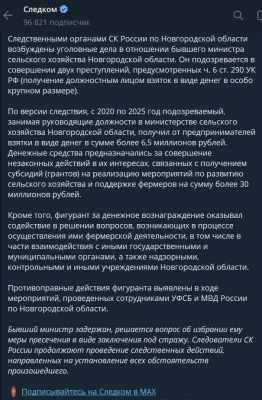 По версии СК, экс-министр с 2020 по 2025 обеспечивал фермерам доступ к субсидиям и грантам «на сумму более 30 миллионов», после чего получал откаты. Общий объём незаконных выплат — свыше 6,5 млн ₽.