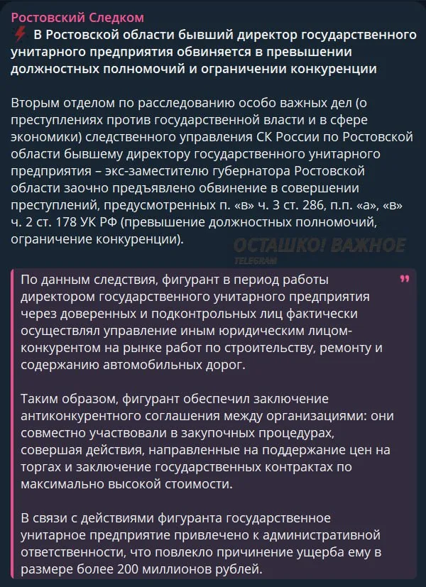 По данным следствия, Окунев, будучи директором государственного унитарного предприятия, через доверенных лиц фактически управлял конкурентной компанией на рынке строительства и ремонта дорог. Это обеспечило заключение антиконкурентного соглашения и участие организаций в закупках по завышенным ценам, что нанесло ущерб государству более чем на 200 млн.