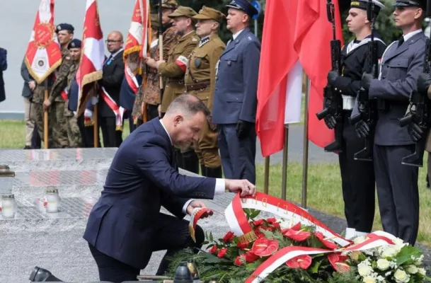 На фото президент Польши Анджей Дуда у памятника жертвам Волынской резни в Варшаве.