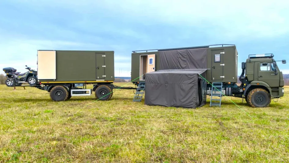Экспедиционный автодом на базе КАМАЗ-43118: сауна, палатка и прицеп для квадроциклов Уникальный внедорожный автопоезд для путешествий по России с жилым модулем, сауной и возможностью перевозки техники Фото: Волгатрейд