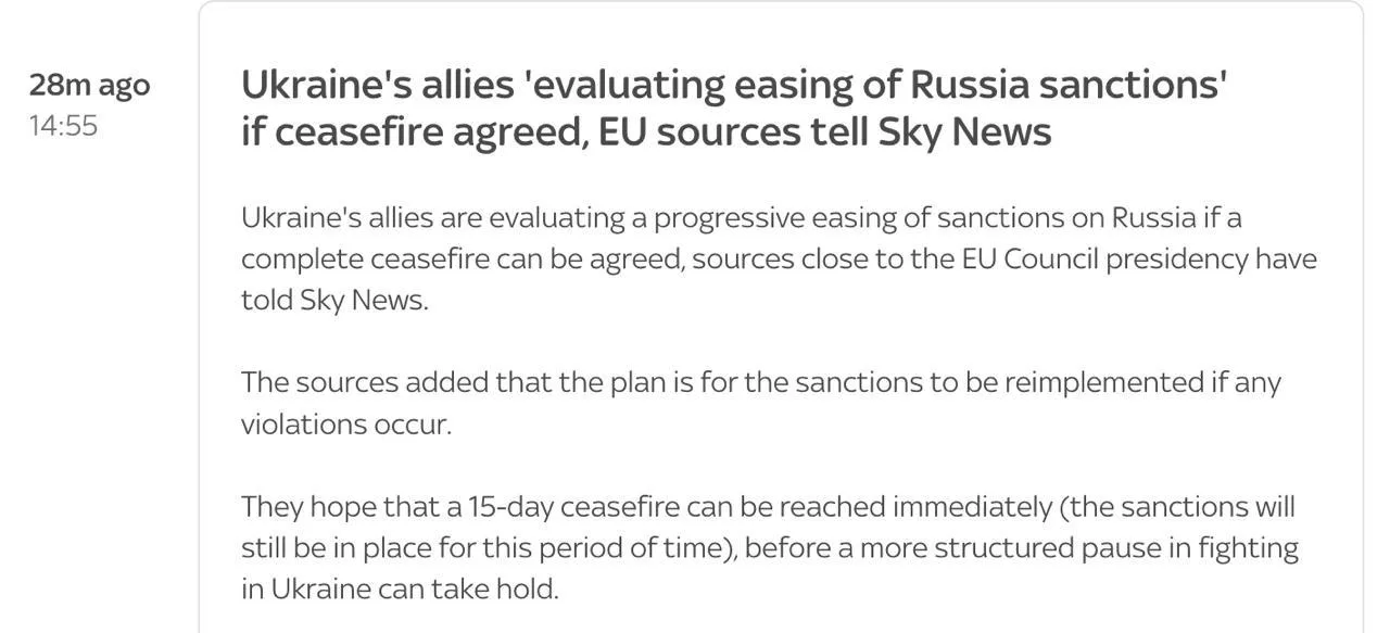 🔴 «Коалиция желающих» обсуждает поэтапное ослабление ограничений при полном прекращении огня и их автоматическое восстановление в случае нарушений со стороны России.