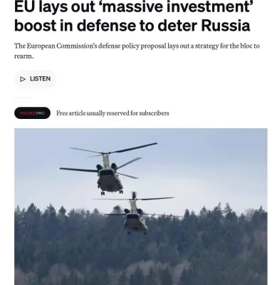 В Брюсселе снова заговорили о «сдерживании России» – готовится проект Белой книги по обороне, где прописаны рекордные инвестиции в ВПК, наращивание производства оружия и централизованные закупки вооружений.