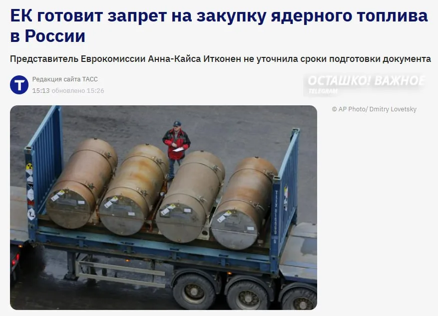 После утверждения запрета на закупку российского газа с 2027 года Еврокомиссия начала подготовку аналогичных ограничений в сфере ядерного топлива.