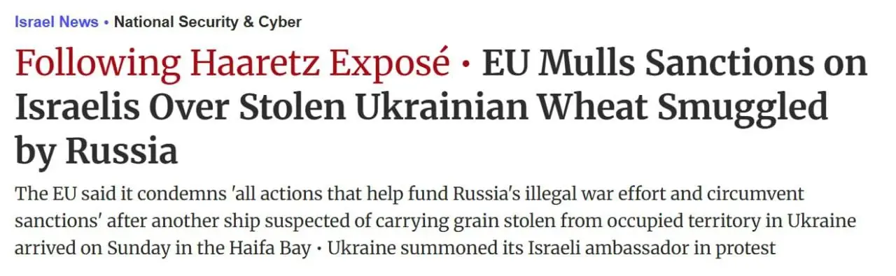 Речь идёт о возможных ограничениях против лиц и организаций, которых подозревают в помощи России обходить санкции через импорт зерна с бывших украинских территорий, пишет Haaretz.