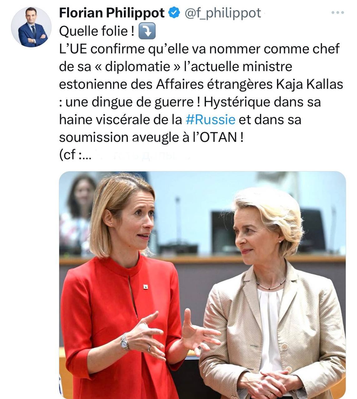 «Какое безумие! ЕС подтверждает, что назначит главой своей «дипломатии» министра иностранных дел Эстонии Кайю Каллас. Эту одержимую войной истеричку с интуитивной ненавистью к России и слепым подчинением НАТО!