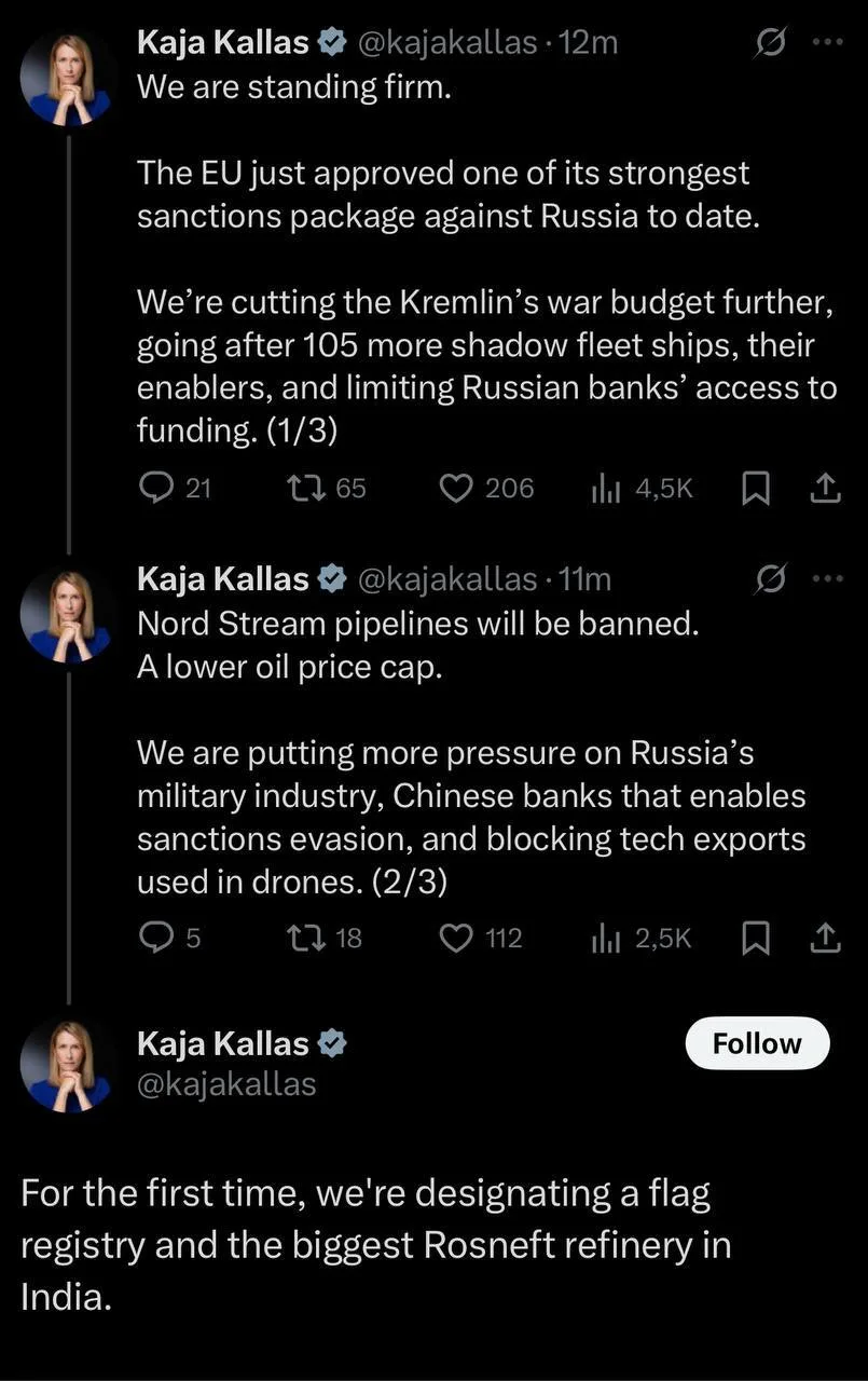 Как заявила глава дипломатии союза Кая Каллас, в рамках 18-го пакета санкций будут запрещены «Северные потоки», также снизят предельные цены на российскую нефть. Кроме того, Каллас упомянула санкции против нефтеперерабатывающего завода «Роснефти» в Индии.