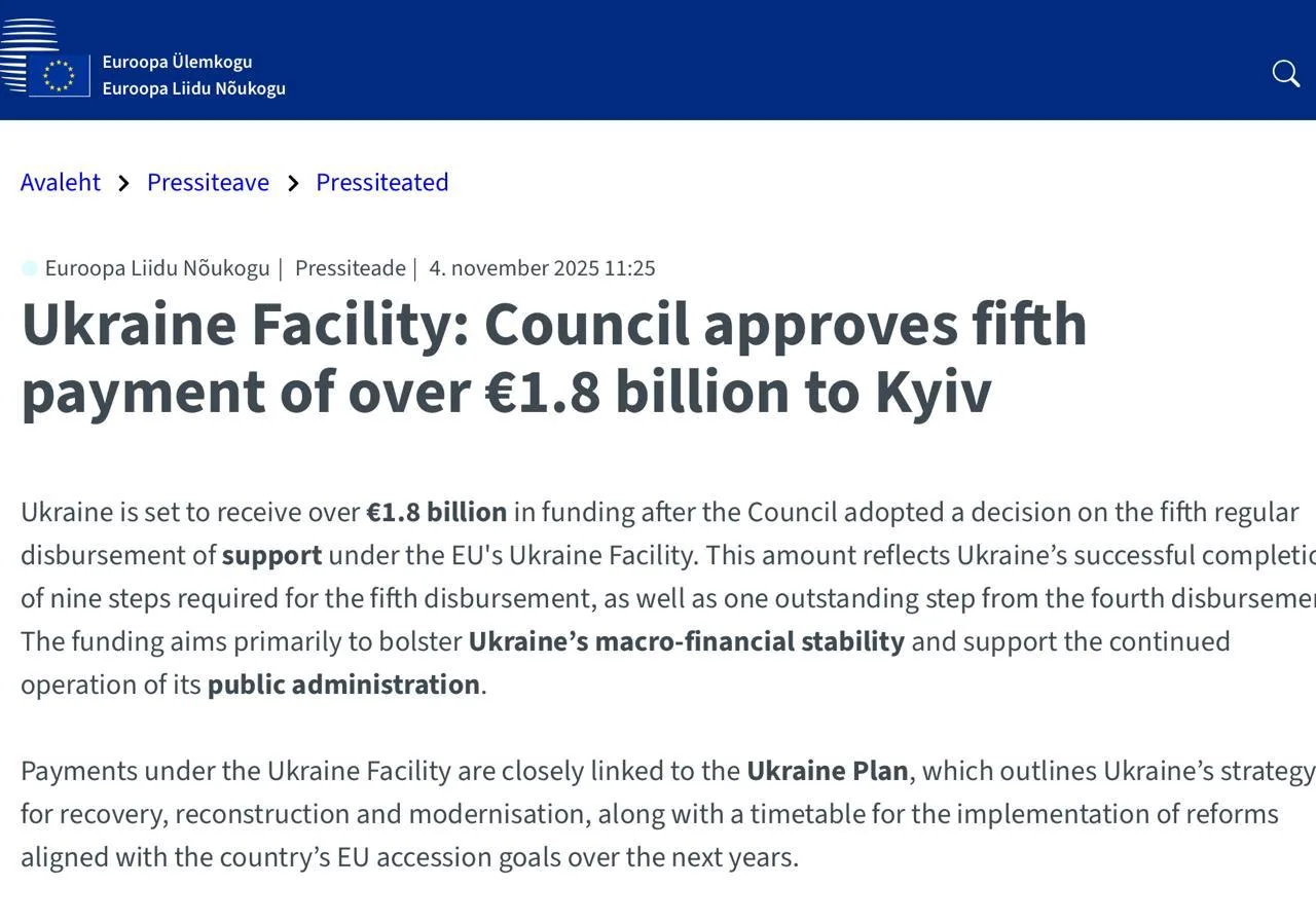Евросоюз выделил пятый транш в 1,8 млрд евро из программы Ukraine Facility. Деньги пойдут на поддержку работы госаппарата и обслуживание долгов, которые Украина взяла у Европы.