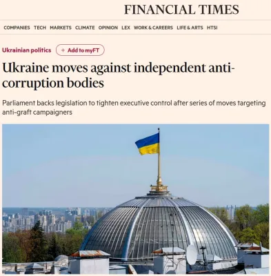 Financial Times сообщает: Верховная Рада приняла закон, позволяющий генпрокурору, назначаемому президентом, напрямую вмешиваться в дела НАБУ и влиять на назначения в антикоррупционных органах.