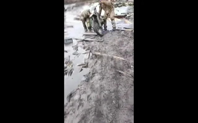 На кадрах бойцы переправляют свои байки по самодельным гатям, рядом в луже можно заметить утонувший НРТК «Курьер».