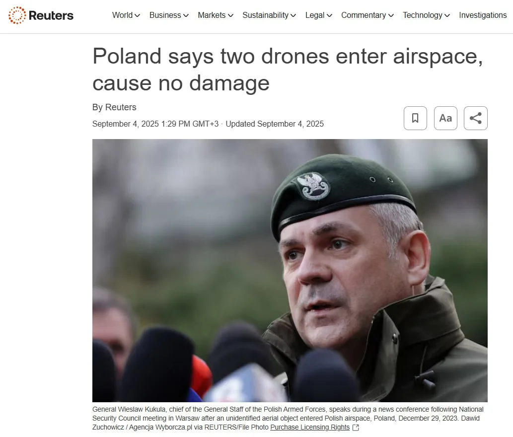 Начальник Генштаба генерал Веслав Кукула добавил, что беспилотники покинули воздушное пространство Польши, не причинив никакого ущерба.