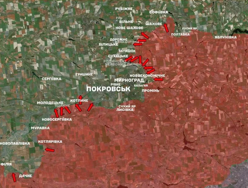 Как можно заметить, на данном участке карты Покровск не то что фактически не захвачен ВС РФ — на ней не отображено даже присутствие и закрепление российской армии внутри города. Украинский генштаб считает (если использует эту или схожую карту), что подразделения армии России находятся лишь на подступах к городу с юга и юго-запада.
