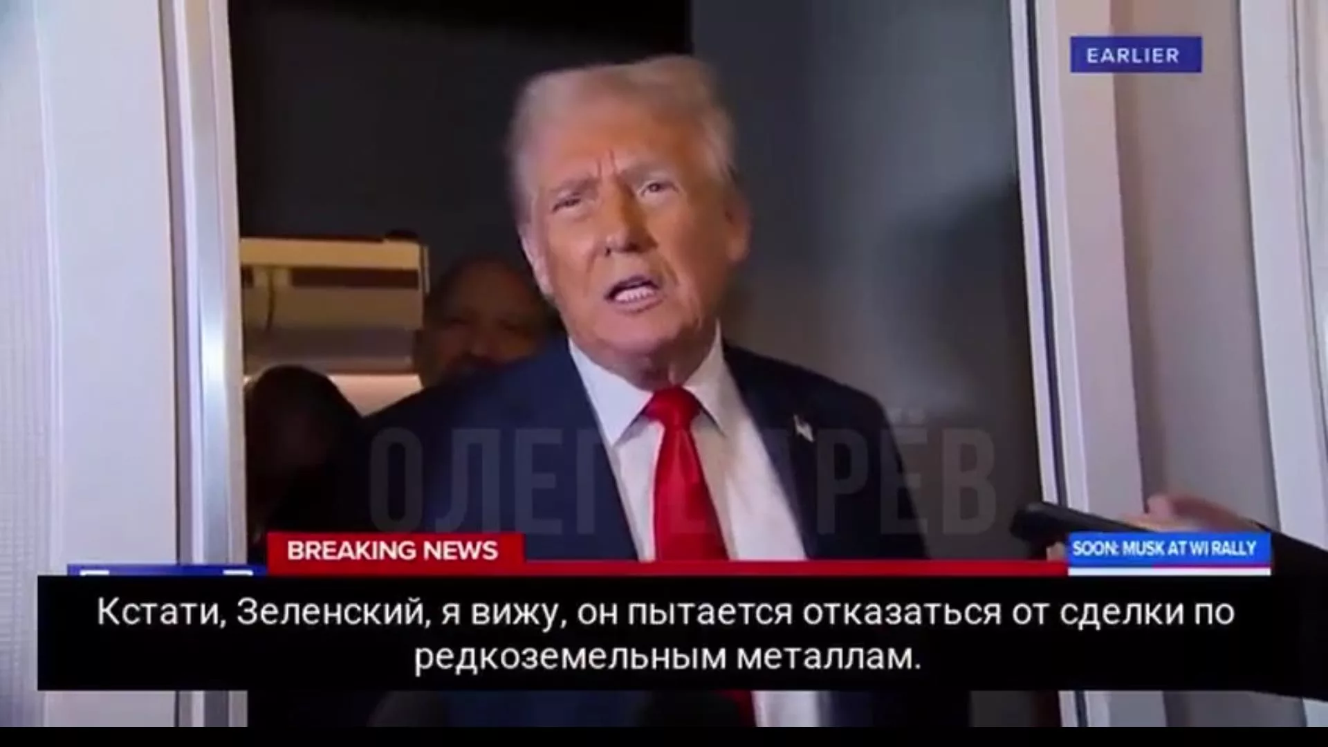 «Кстати, я вижу, что Зеленский пытается отказаться от сделки по редкоземельным металлам. И если он это сделает, у него возникнут проблемы, большие-большие проблемы. Мы заключили сделку по редкоземельным металлам. А теперь он говорит: «Ну, вы знаете, я хочу пересмотреть условия сделки». Он хочет стать членом НАТО.Ну, он никогда не станет членом НАТО. Он это понимает. Так что, если он хочет пересмотреть условия сделки, у него большие проблемы».