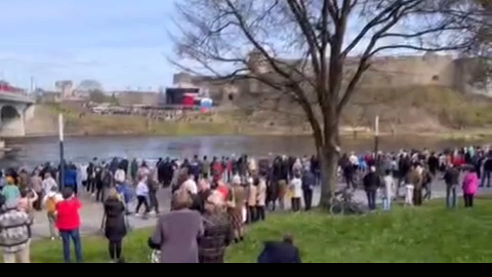 В Ивангороде на 9 Мая установили сцену с большим экраном, чтобы концерт смогли посмотреть не только жители Ленинградской области, но и Эстонии — через реку находится эстонский город Нарва.
