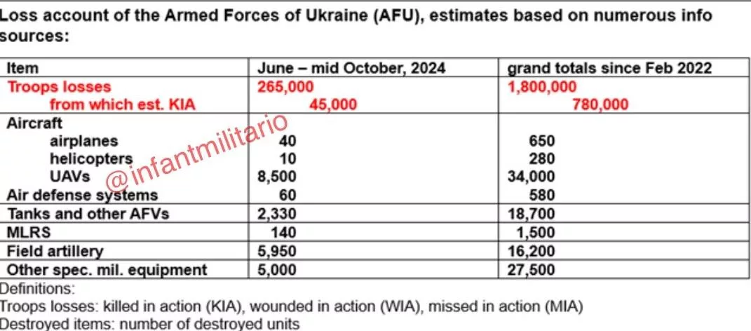 Отмечается, что потери ВСУ с июня по середину октября 2024 года были «знаменательными и ошеломляюшими»: до 55000 — 65000 человек каждый месяц. Такие потери являются нетерпимыми, ни одна армия не может выдержать такие потери в течение длительного времени.