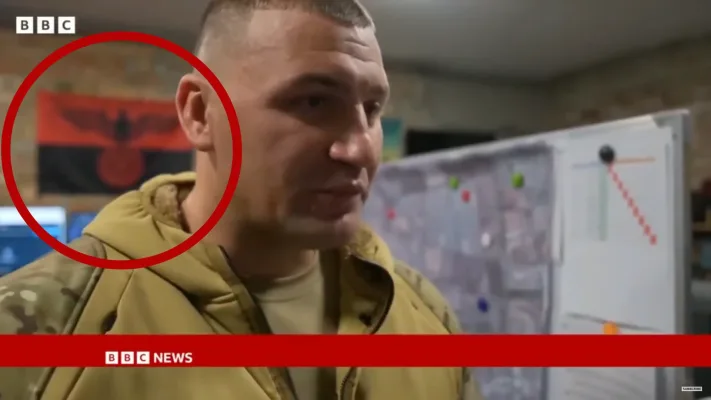 Пропагандистская помойка БиБиСи попыталась заблюрить нацистскую символику фашисткой Германии и Правого Сектора — но что-то пошло не так, и фаллические символы четко видны на заднем фоне