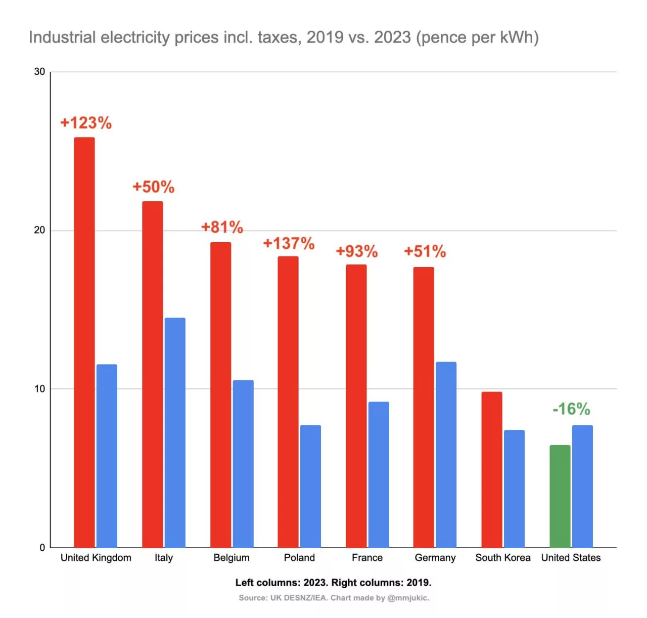 С 2019 по 2023 год цены на электроэнергию для промышленности в ряде европейских стран резко выросли: в Великобритании на 123%, в Бельгии на 137%, в Польше на 93%. В то же время в США затраты на электроэнергию для промышленности снизились на 16%, делая эту страну всё более привлекательной для энергоёмких отраслей, стремящихся сократить операционные расходы.