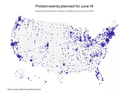 Через три дня по всей территории США пройдут масштабные протесты против Трампа – акция «Без королей» охватит более 1800 городов во всех 50 штатах, сообщает Axios. Ожидается участие миллионов людей.