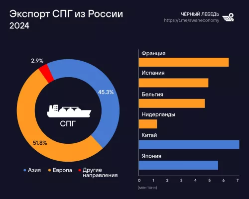 По итогу 2024 года Европе досталось немногим больше половины (51,8%) российского СПГ. Оставшаяся часть поставок пришлась на страны Азии, среди которых лидерами стали КНР и Япония.